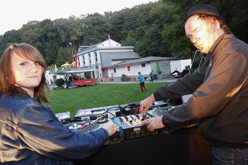 Zwar regnete es nicht, aber es war schlicht zu kühl, wurde als Grund für die spärliche Resonanz ausgemacht – schließlich wurden auf der immerhin gut besuchten Terrasse des Freibad-Restaurants „Haus Neuenhof“ die ersten Glühweine ausgeschenkt. Begeistert von der stimmungsvollen Atmosphäre waren sich viele der wenigen Besucher daher darin einig: In einer lauen Sommernacht würde eine „Superbaden-Party“ brummen. Dass es bei einigen der unentwegten Party-People noch längere Gesichter gab, war allerdings nicht nur der geringen Besucherzahl geschuldet: Statt der angekündigten zwei „Musik-Areas“ gab es nur eine. Immerhin legten Ralf P. und D-Jane Jana in der „Main Area“ auf, packten allerdings auch schon gegen 21 Uhr ihre Platten zusammen – wer später kam, schaute in die Kiste…