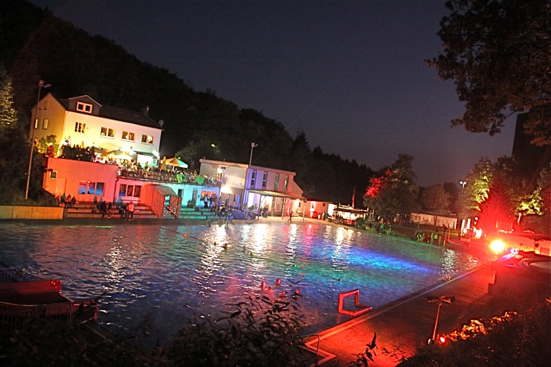 „Na ja…wären die gefühlten 100 Mann, die nur vor der Tür standen und schauten, ob jemand da ist, reingekommen, wäre es sicher lustiger geworden“, lautet ein Facebook-Eintrag zum „Superbaden“ am gestrigen Samstag, 15. September 2012: „Aber sie schauten und gingen…selber schuld.“ Das trifft den Nagel auf den Kopf: Die Freibad-Party des U-Club und des SV Neuenhof im Rahmen des Event-Marathons „Wuppertal 24h live“ war ein Schlag ins Wasser. Aber sie fiel nicht ins Wasser, ganz im Gegenteil: Das Cronenberger Freibad war durch Scheinwerfer stimmungsvoll in Szene gesetzt und 29 Grad Wassertemperatur vorbereitet – obwohl sich allein via Facebook über 400 „Follower“ für die Freibad-Party angemeldet hatten, blieb die Zahl der Cubberer am Beckenrand beziehungsweise im beheizten Wasser aber ziemlich überschaubar.