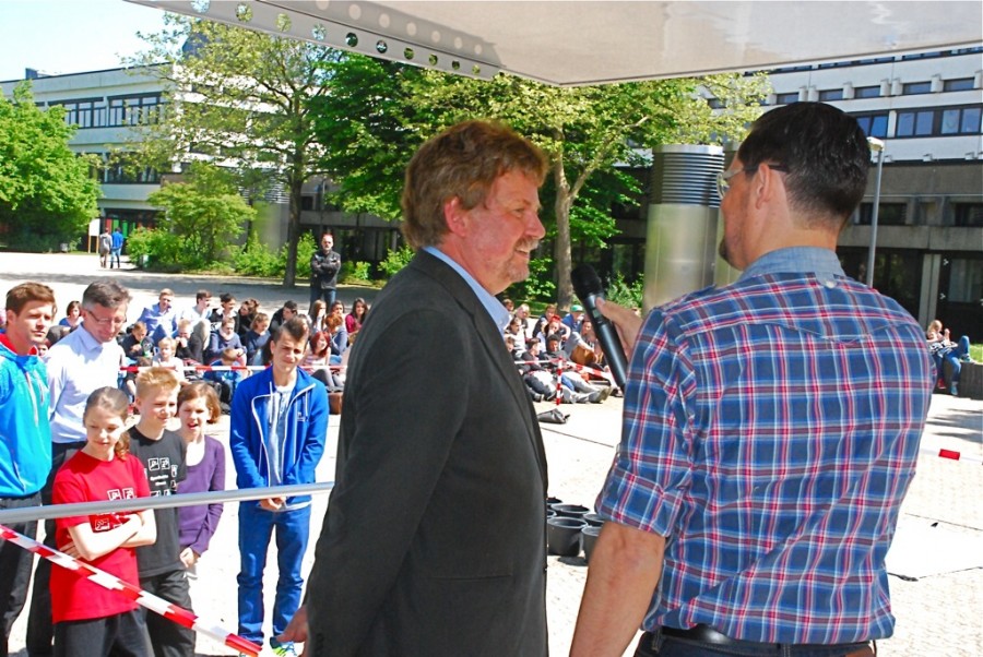 Die Sportschuhe hatte Schuldezernent Matthias Nocke indes aber nicht umsonst angezogen: Neben einem Hindernislauf mit vollen Wasserbechern galt es nämlich auch den Inhalt von zehn vollen Wassereimern in eine Plastikplane zu schütten und das Nass über 20 Meter zu einem Behältnis zu transportieren – natürlich möglichst ohne Verluste. Während FBR-Lehrer Tim Focke zu den Bechern griff, packte Matthias Nocke beim Wasserplanen-Transport mit an, und wenn beim letzten Einschütten nicht jede Menge Liter neben dem Sammelbehälter gelandet wären, ja dann…Tja, es ging aber einiges daneben und am Ende waren nur 75 der insgesamt 100 Liter „drin“ – das waren 678 Punkte; „es geht schlechter“, munterte Thorsten Schlautmann das Wuppertal-Team auf. „Es war gut“, befand auch Matthias Nocke: „Nur beim letzten Einfüllen haben wir nicht richtig aufgepasst.“ Auch hierzu hatte Moderator Schlautermann einen flotten (positiven) Spruch: „Meine Füße sind trocken geblieben, das war die Hauptsache!“