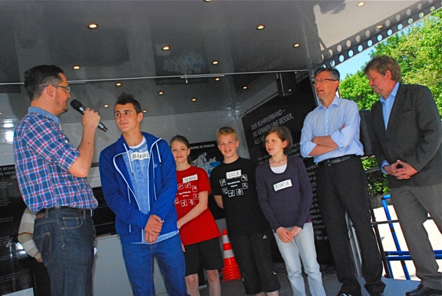 Die Hauptsache indes war am Ende die Gesamtzahl der erreichten Punkte, denn nur die punktbesten sechs Städte-Teams schaffen es in die Finalrunde, die am 14. Juli 2013 am Sorpesee ausgespielt wird. Unter dem Strich standen für die Bayer-Realschule sowie ihren Stadtpaten Matthias Nocke 3.758 Punkte zu Buche – leider 152 Punkte zu wenig für das Ticket zum Sorpesee – das Wuppertal-Team belegt damit aktuell Platz 10. Spitzenreiter ist derzeit übrigens Rüthen mit schwer zu knackenden 4.291 Punkten. Wobei: Für die Betreuung durch die Schule, leckere Käseschnecken in der Mensa, Schulzentrum-Führung („Ich kenne jetzt sogar die Lehrer-Toilette“) sowie die Basketball-Körbe auf dem Pausenhof erkannte „Quizmaster“ Thorsten Schlautermann der Bayer-Realschule 1.000 Sympathiepunkte extra zu – nur die gingen nicht in die Wertung ein, leider!