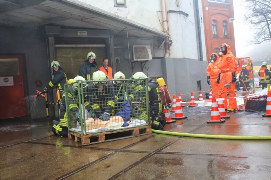 „Bei der Firma Stahlwille hatte die automatische Brandmeldeanlage ausgelöst“, erläuterte Brandinspektor Andreas Homm, der den FFC-Zug im Rahmen der Übung führte, das „Unglücks-Szenario“: „Schnell wurde jedoch klar, dass sich auf dem Betriebsgelände ein Kranunfall ereignet hatte, bei dem eine ätzende Flüssigkeit aus einem Transportbehälter freigesetzt und dadurch mehrere Personen verletzt wurden“, so Homm weiter. Sofort begannen mehrere Trupps unter Atemschutz, die Verletzten aus dem Gefahrenbereich zu bringen. „Teilweise waren die Verletzten unter schweren Lasten eingeklemmt, sodass wir technisches Gerät vornehmen mussten, um diese zu befreien“, berichtete der Brandinspektor der Dörper Wehr. Für die Sicherung des leckgeschlagenen Behälters und das Auffangen der auslaufenden Flüssigkeit wurden dann die Spezialisten des Umweltschutzzuges angefordert; insgesamt waren schließlich circa 50 Kräfte an der Übung beteiligt.