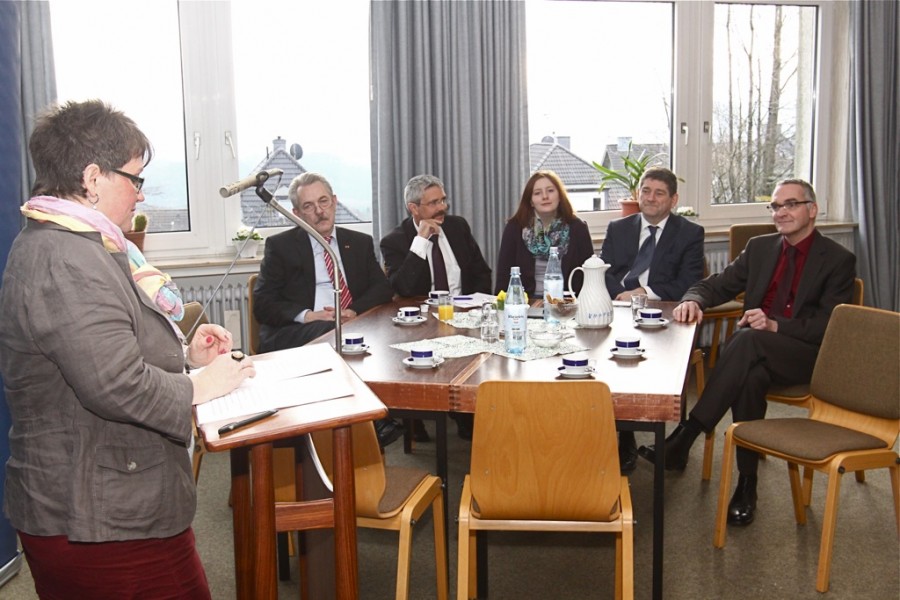 Auch SPD-Politiker aus Bezirk, Stadt und Land konnte Ortsvereinsvorsitzende Ursula Abé beim Neujahrsempfang begrüßen: Neben Ratsherr Oliver Wagner (re.) und Hans-Peter Abé, dem SPD-Fraktionschef in der Dörper Bezirksvertretung (li.), kamen Landtagsabgeordneter Josef Neumann (2.v.li.), Ratsfraktionschef Klaus Jürgen Reese und Wuppertals SPD-Vorsitzender Dietmar Bell (2.v.r.) in die Friedenskirche.