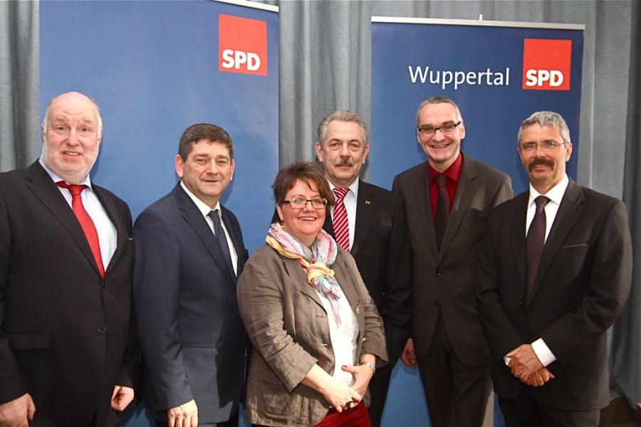 Auch SPD-Politiker aus Bezirk, Stadt und Land konnte Ortsvereinsvorsitzende Ursula Abé beim Neujahrsempfang begrüßen: Neben Ratsherr Oliver Wagner (re.) und Hans-Peter Abé, dem SPD-Fraktionschef in der Dörper Bezirksvertretung (li.), kamen Landtagsabgeordneter Josef Neumann (2.v.li.), Ratsfraktionschef Klaus Jürgen Reese und Wuppertals SPD-Vorsitzender Dietmar Bell (2.v.r.) in die Friedenskirche.