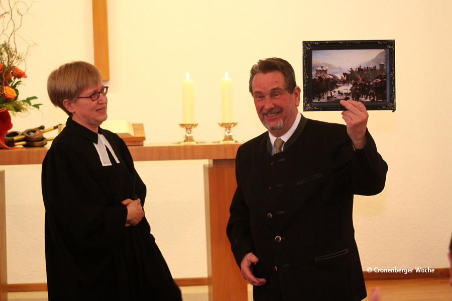 Und auf den Gerne-Telefonierer reimte Thomas Orth: „Wer vergisst nichts und niemanden und führt viele Telefonate?“ Im Chor antworteten die vielen Gästen des Empfangs da was? „Helmut Pathe“, natürlich. Zugleich drückte Thomas Orth die gereimte Zuversicht aus, dass die Gemeinde auch weiterhin auf Helmut Pathe bauen dürfe: „Wen ziehen wir auch in Zukunft gerne zu Rate? – …“ Der neue Presbyteriumsvorsitzende schloss seine kurzweilige Laudatio auf das Herzstück von Evangelisch-Küllenhahn mit dem „Gleichklang“: „Es klingt in jeder Kemenate: Küllenhahn dankt Helmut Pathe!“