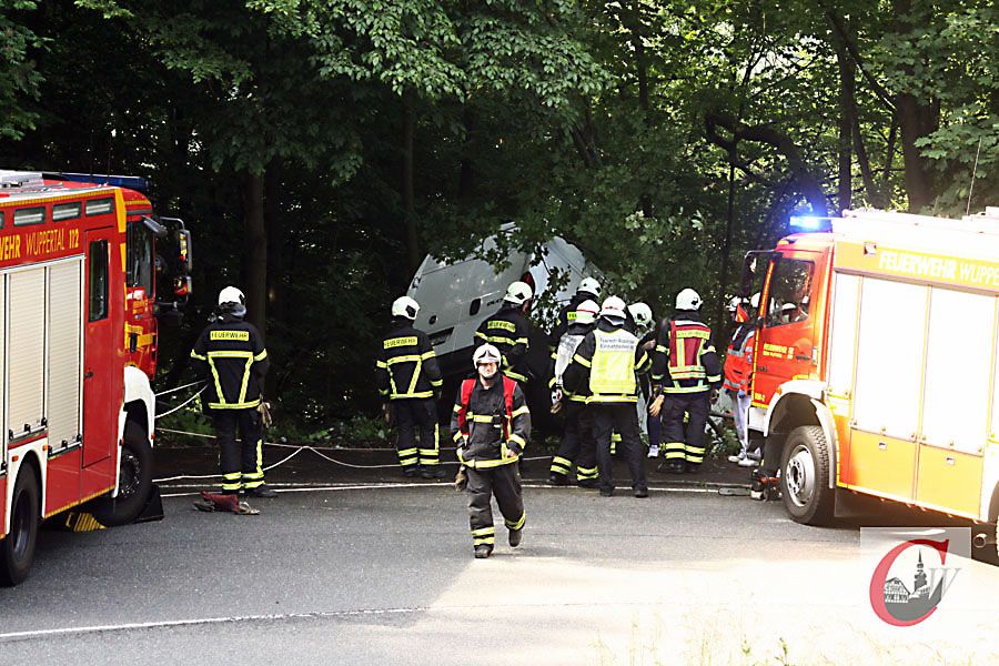 Nur den Bäumen dort ist es zu verdanken, dass der Transporter nicht den Abhang zur Kohlfurth hinunter stürzte. Ein Insasse musste durch die Feuerwehr aus dem des Fahrzeug befreit werden, verletzt wurde offenbar niemand. Die Einsatzkräfte haben die Unfallstelle in beiden Richtungen abgesperrt.