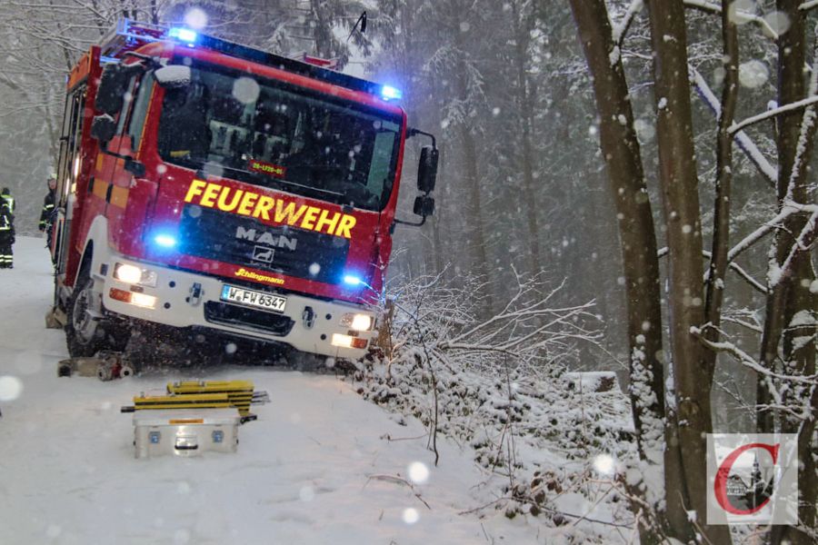 Mitten in einem Hilfe-Einsatz mussten Retter der Freiwilligen Feuerwehr Cronenberg (FFC) heute Nachmittag, 30. Januar 2019, selbst um Hilfe rufen: Ein Löschfahrzeug war mitten im Wald auf der spiegelglatten Alten Rottsieper Straße ins Rutschen gekommen und drohte einen Abhang hinabzustürzen.