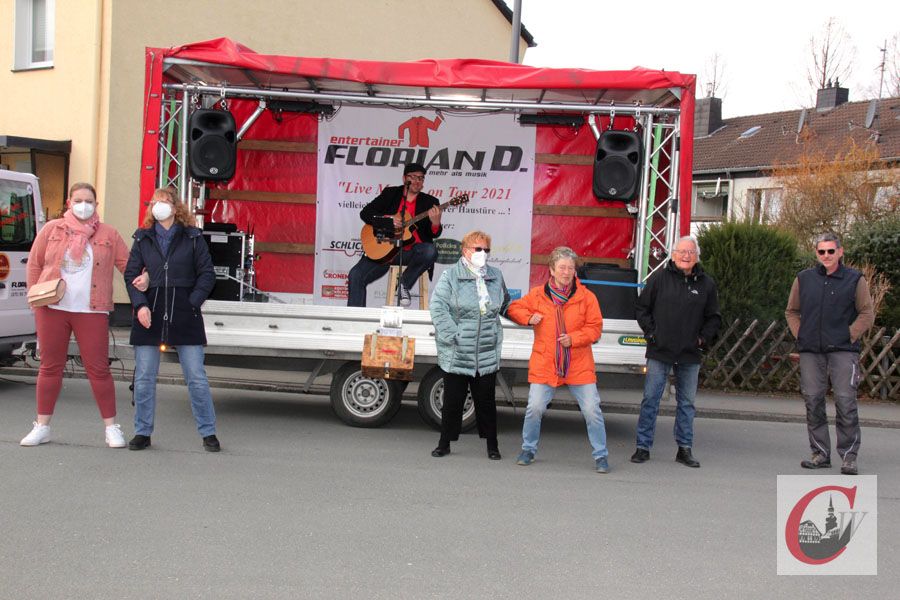 Groß war die Begeisterung jedes Mal, als Florian D. seine beräderte Anhänger-Bühne erklomm. Mithilfe eines Stromgenerators erklangen ebenso das „Wuppertal-Lied“ wie Schlager, Rock’n’Roll oder auch Evergreens – für jeden Geschmack war etwas dabei. Immer wieder gab es „Daumen hoch“, bei Kälte und Graupelschauern tanzte sich so mancher „Zaungast“ warm und Hofschaften oder Straßen verwandelten sich in Tanzflächen. Die Gewinner genossen jede Sekunde ihrer Mini-Konzerte, jeder fühlte sich geehrt und mancher filmte das Konzert sogar mit – als eine bleibende Erinnerung aus Corona-Zeiten: „Auf so eine Idee muss man erst mal kommen“, hörte man lobende Worte: „Einfach toll“ oder: „Was für eine wunderbare Idee!“